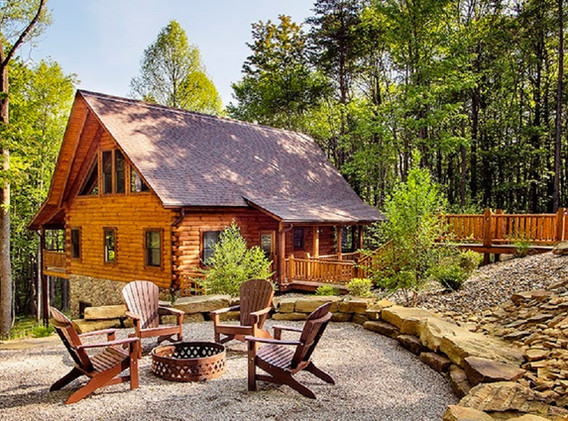 Decor has an Alaskan pioneer feel with a unique antler chandelier, showers lined with river rock, and two living space gas stoves for warmth. Custom-made log tables in the living room sit atop a cowhide rug. A separate spa and bathhouse on the edge of a pine forest provide a unique Alaskan experience in the heart of Hocking Hills. Stunning wall-to-wall reclaimed barn wood flooring round out the ultimate cabin feel.